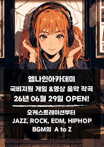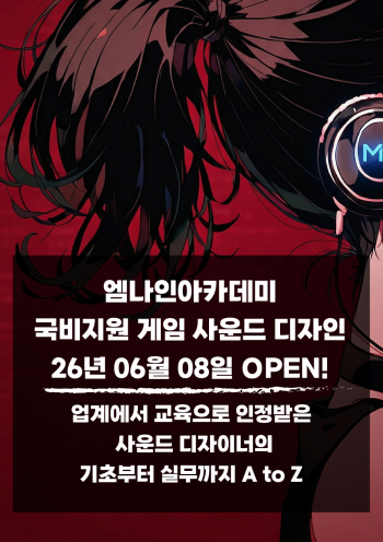 엠나인아카데미학원은 게임 사운드 디자인, 게임 음악 작곡, 영상 사운드 디자인/음악작곡, 비쥬얼아트 전문교육 학원으로서